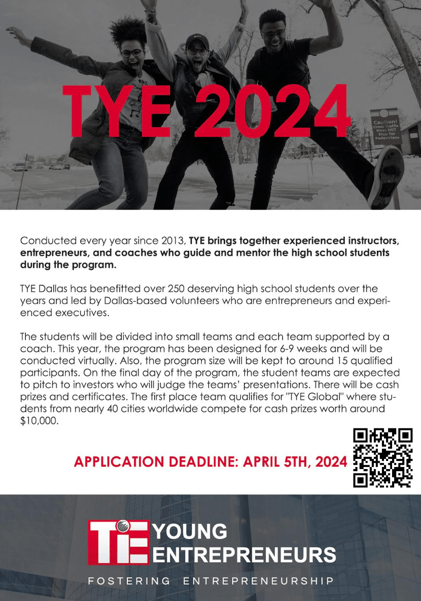 If you have aspiring entrepreneurs who are still high schoolers looking for mentorship and structured hand-holding in their entrepreneurial journey, look no further. Please encourage them to sign up for this tried and tested TYE program. The applications close by April 5th, 2024